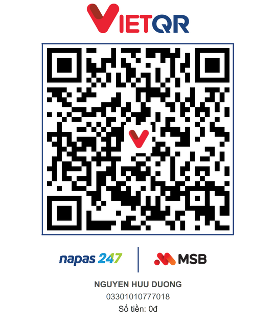 Quý cư dân vui lòng chuyển khoản qua số tài khoản: 03301010777018(MSB) chủ tài khoản: Nguyễn Hữu Dương, hoặc quét mã QR sau để thanh toán.